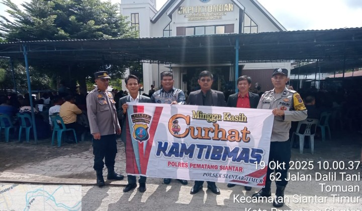 Pematangsiantar !!! Kompakonline.com -Polsek Siantar Timur Polres Pematangsiantar melalui Kanit Samapta IPDA Todo Tamba bersama Piket Bhabinkamtibmas AIPDA Okto Sihole dan AIPDA G. Sinaga menggelar kegiatan Minggu Curhat Kamtibmas di Gereja GKPI JK Tomuan, Jalan Narumondah Bawah, Kelurahan Tomuan, Kecamatan Siantar Timur, Kota Pematangsiantar, pada hari Minggu ( 19 / 10 / 2025 ) pagi sekira pukul 10.00 Wib.