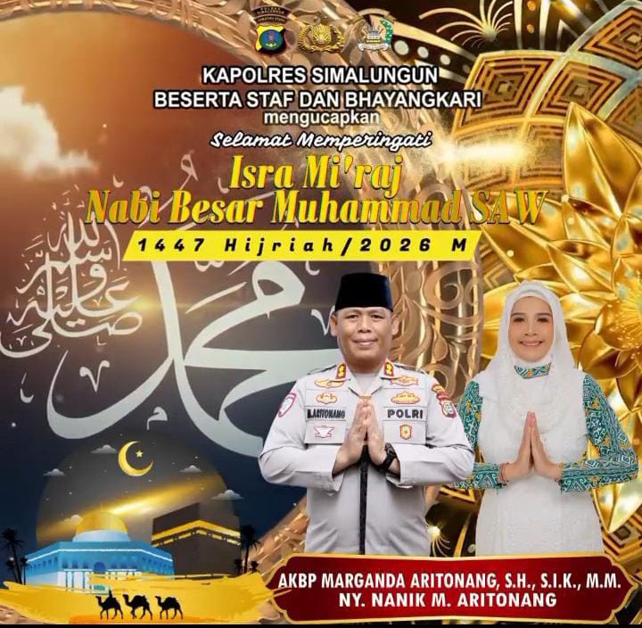 Simlungun !!!! Kompakonline.com – Momentum Isra Mi’raj Nabi Besar Muhammad SAW bukan hanya peringatan biasa, tapi momen untuk memperkuat landasan spiritual dalam menjalankan tugas. Kapolres Simalungun AKBP Marganda Aritonang bersama seluruh jajaran Polres Simalungun dan Bhayangkari mengucapkan selamat memperingati Isra Mi’raj 1447 Hijriah/2026 M.