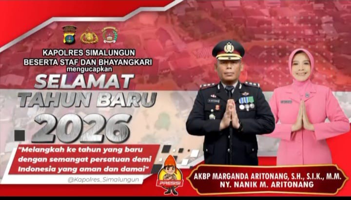 Simalungun !!!! Kompakonline.com – Dengan penuh harapan dan optimisme, jajaran Polres Simalungun yang dipimpin Kapolres AKBP Marganda Aritonang, SH, S.I.K, MM, bersama seluruh staf dan Bhayangkari menyampaikan ucapan selamat tahun baru 2026 kepada masyarakat Simalungun dan seluruh rakyat Indonesia.