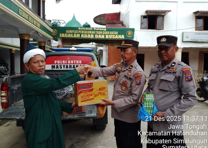 Polsek Tanah Jawa Polres Simalungun menyalurkan bantuan kemanusiaan kepada korban bencana melalui Persulukan Tuan Guru Batak di Jawa Tengah, Kecamatan Tanah Jawa, Kabupaten Simalungun, pada Minggu ( 21 / 12 / 2025 ) siang.