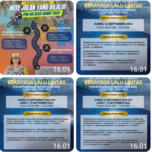 Lanjut diterangkannya, rekayasa lalu lintas yang akan diterapkan Polres Pematangsiantar dan Pemko Pematangsiantar adalah pada tanggal 12 dan 13 September 2024. Untuk tanggal 12 September 2024 terdapat penambahan titik rekayasa lalu lintas karena ada titik start road bike (balap sepeda) atlet putri jarak dekat dan untuk tanggal 13 September 2024 ada perlintasan road bike (balap sepeda) atlet putra jarak jauh dan dekat serta atlet putri jarak jauh.