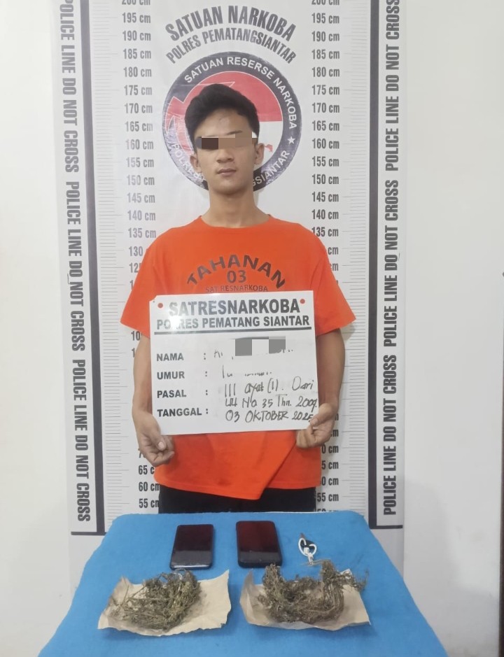 Pematangsiantar !!! Kompakonline.com -Satuan Reserse Narkoba Polres Pematangsiantar menangkap AS (18) warga Jalan Tangki Kelurahan Nagapita Kecamatan Siantar Martoba Kota Pematangsiantar memiliki narkotika jenis ganja berat bruto 29,46 gram di Jalan Pendidikan Kelurahan Sigulang – gulang Kecamatan Siantar Utara Kota Pematangsiantar, pada Jumat ( 03 / 10 / 2025 ) dini hari sekira pukul 01.00 Wib.