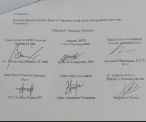 Adapun kesepakatan tersebut antara lain agar segera relokasikan lahan sekolah SMAN-5 Pematangsiantar dalam radius jarak +/- 1 Km dari lokasi sekolah saat ini, mempersiapkan gedung bangunan sekolah baru peruntukan SMAN 5 Pematangsiantar sesuai daya tampung maksimal siswa yang ada, DPRD dan Pemerintah Provinsi Sumatera Utara sepakat menampung anggaran untuk relokasi lahan dan pembangunan gedung sekolah baru SMAN-5 Pematangsiantar dalam P-APBD Tahun 2026, Proses segera appraisal lahan relokasi sekolah ditambah D. E D Pembangunan gedung baru dalam P-APBD 2026. ( HN ).